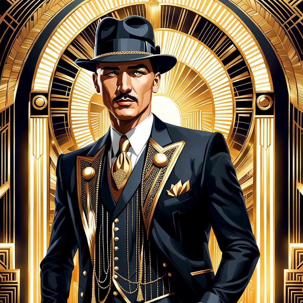 A digital artwork of a flapper girl and a suited man in a 1920s speakeasy. The art deco architecture is rendered with visible brushstrokes and a warm, golden glow, as digital empรขtement.