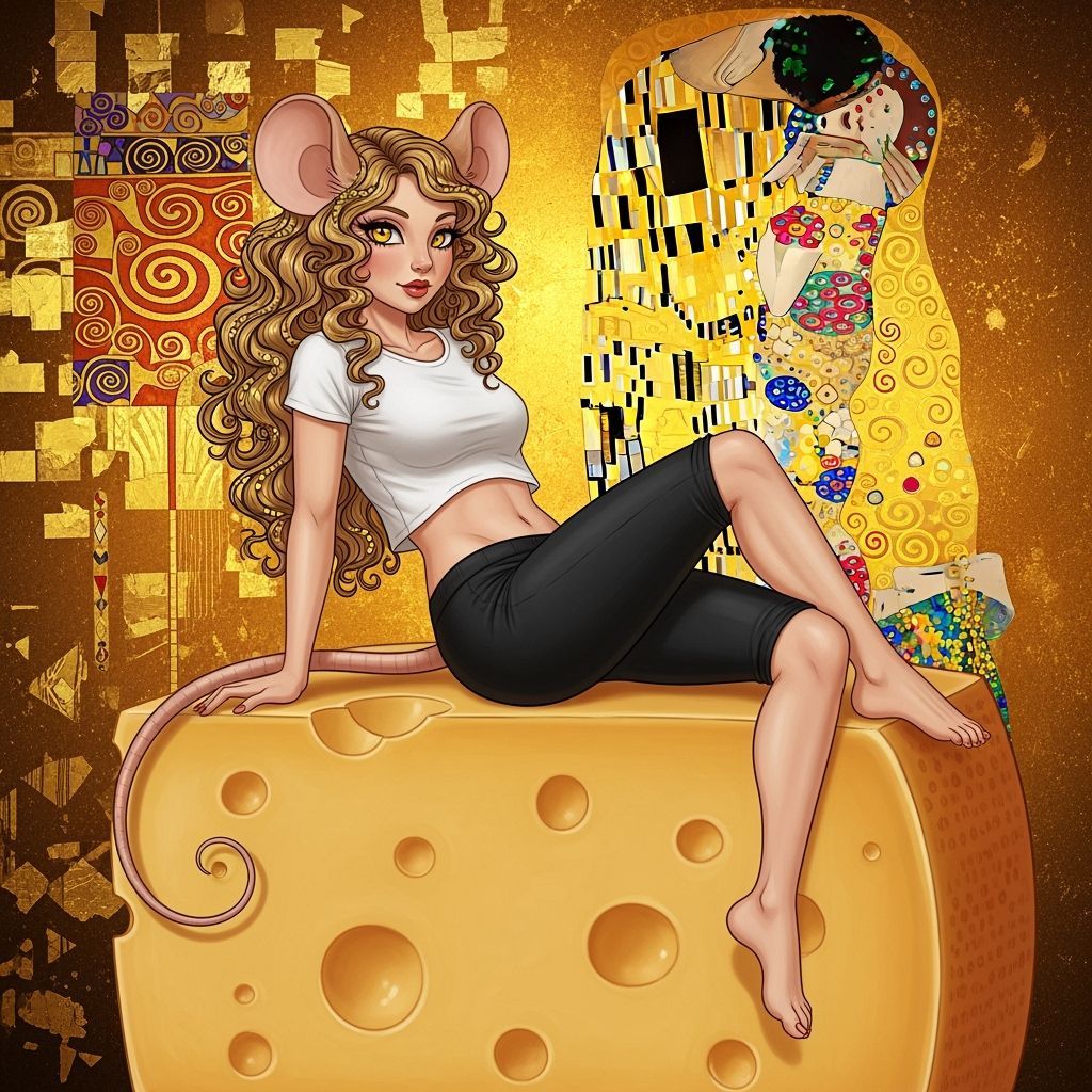 A striking image of an anthropomorphic mouse woman lounging sensually on a giant Swiss cheese wheel, rendered in a luxurious Art Nouveau style reminiscent of Gustav Klimt's golden period.