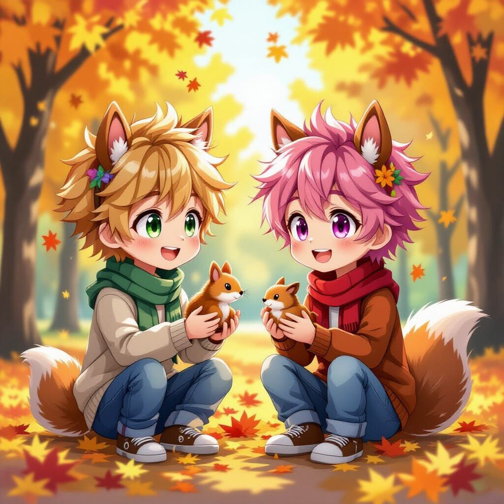This bright anime drawing features two young men with blonde and pink hair, sporting horse ears. They smile in a windy park amidst autumn leaves, rendered with vibrant colors and detailed textures.