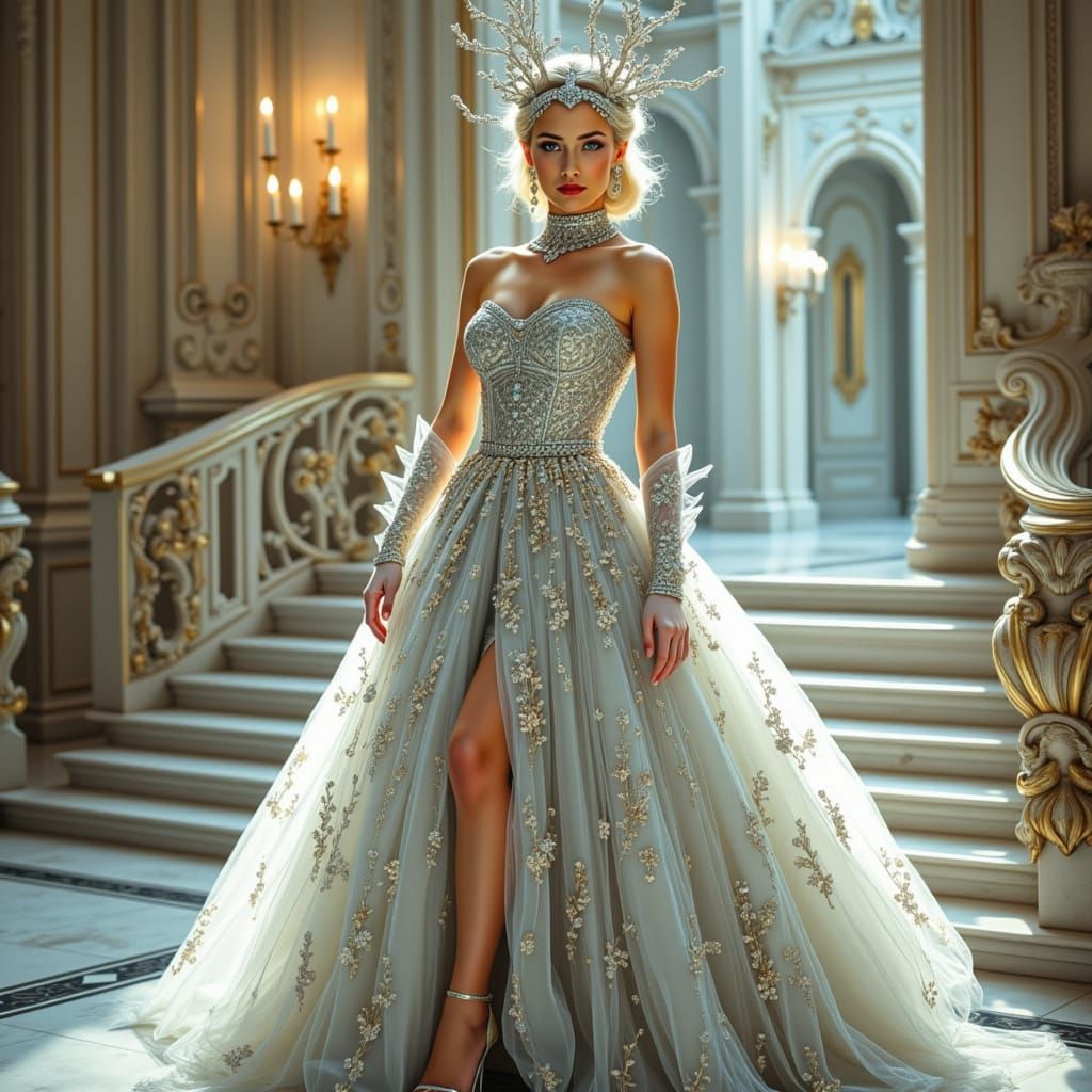 A striking picture of a princess on marble stairs in a crystal palace. She wears a couture gown with starlight crystals, gold embroidery, and a silver crown, in a dreamy and elegant aesthetic.