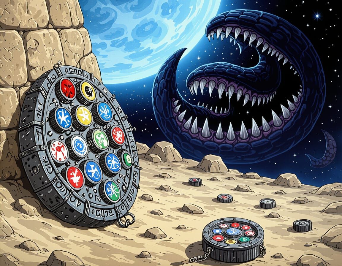 This image shows a surreal, occult scene with cosmic and dark fantasy elements. It features geometric patterns, astral imagery, and gothic motifs, creating a bizarre and otherworldly aesthetic.