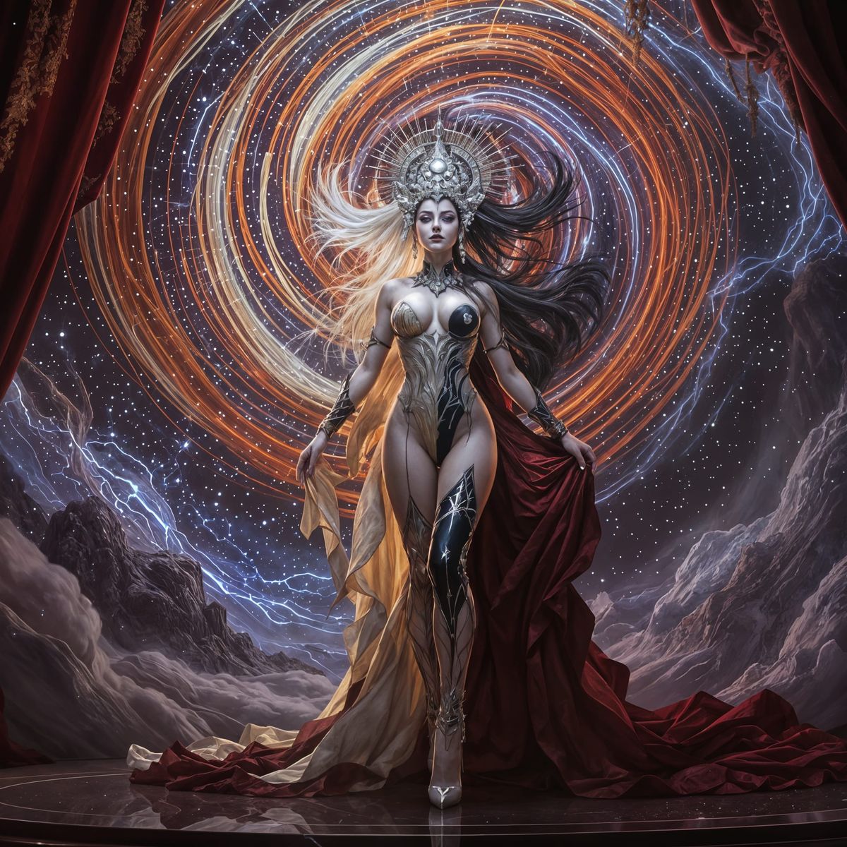 A captivating image of a showgirl embodying yin and yang on a stage before a mystical landscape. The piece is a hyperrealistic digital rendering with dynamic lighting and intricate costume details.