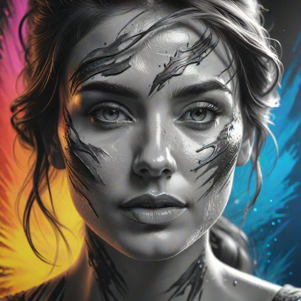 This hyperrealistic charcoal drawing features a beautiful woman with intricate facial details and dramatic side lighting. The splash art style adds depth and color.