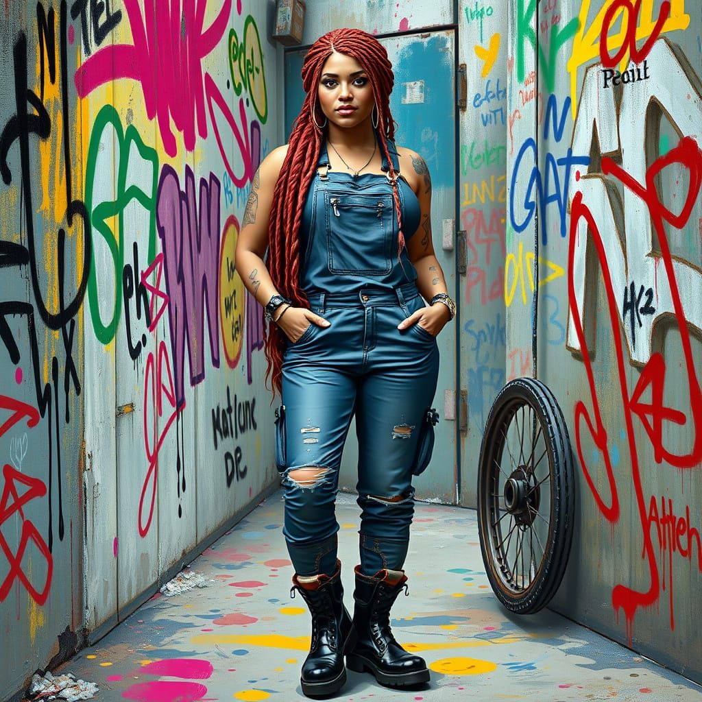 A digital painting of Gadget Hackwrench reimagined as a curvy adult woman. She has light red braids, wears oil-stained overalls and black boots, set against graffiti art with bright, bold colors.