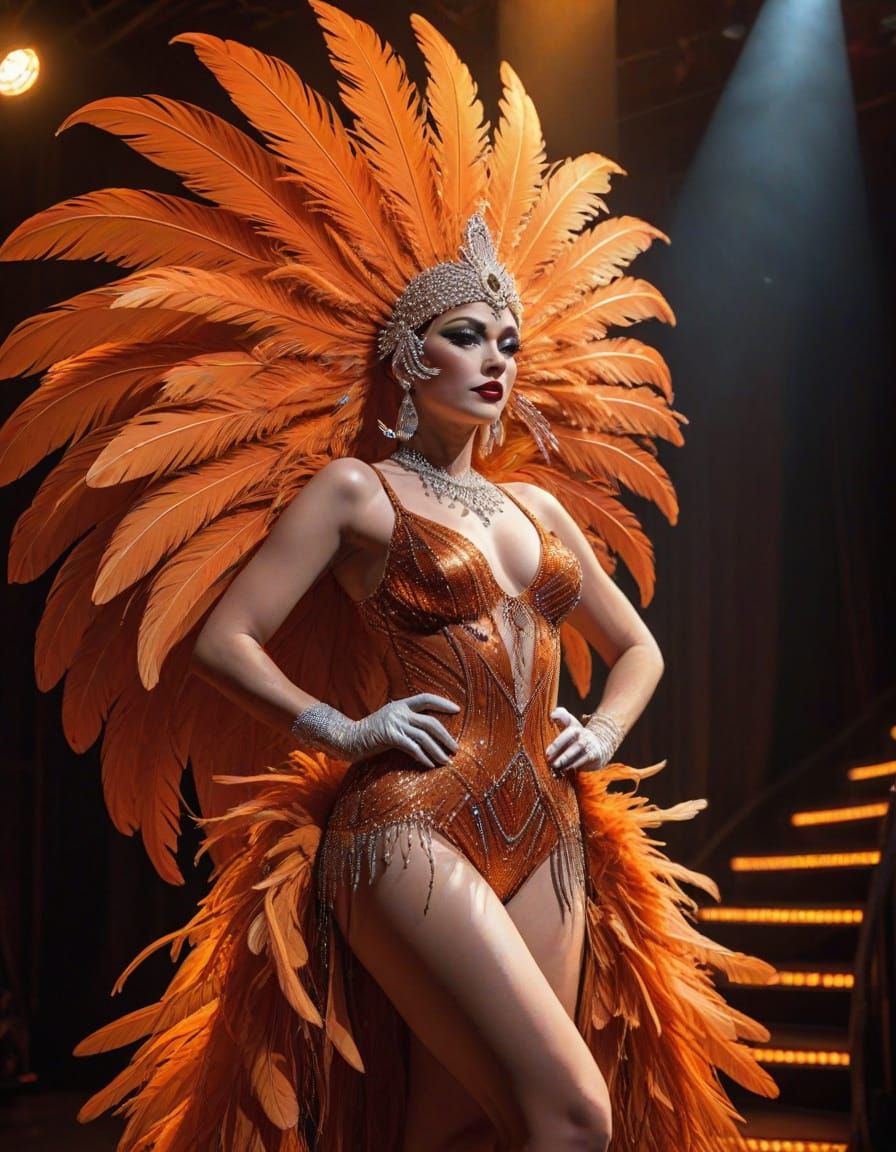 This image shows a vintage cabaret dancer wearing an orange feathered headdress and glittering costume. The stage is lit with dazzling lights, creating a fantasy atmosphere.