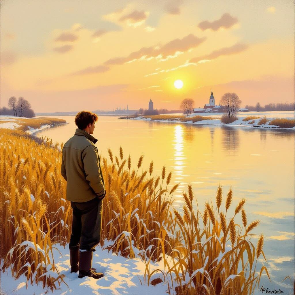 This image captures a young man by the Volga River, blending ripe wheat fields and snowy vistas. Rendered with soft brushstrokes and warm light, it evokes a feeling of longing.
