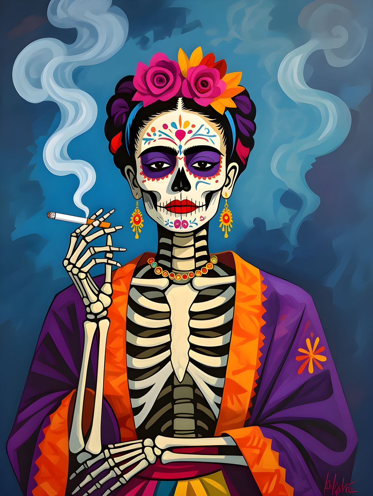 This image depicts a striking scene of Frida Kahlo surrounded by Day of the Dead skeletons in vibrant purple and orange hues, with smoke swirling around her as she holds a cigarette in a bony hand.