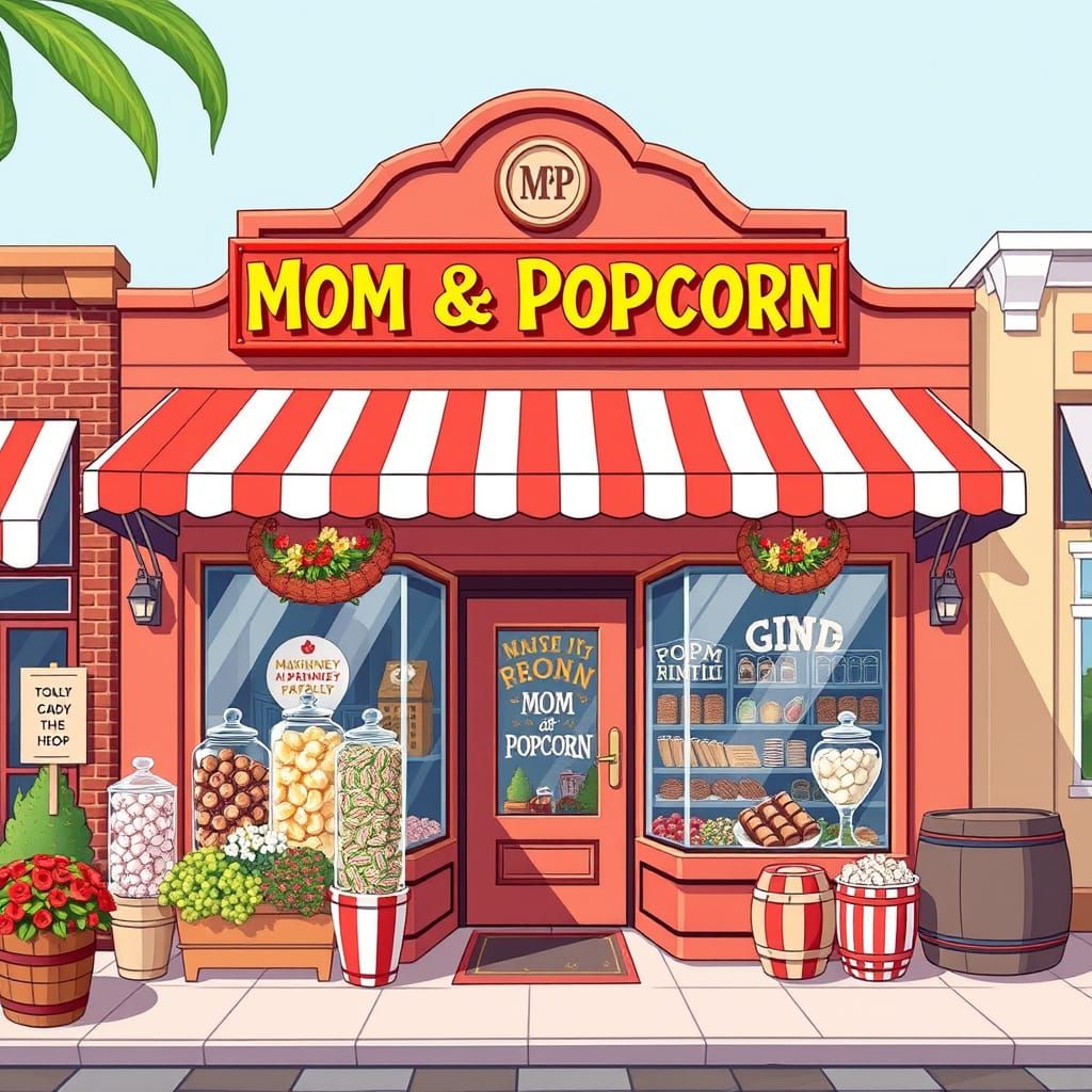 This charming illustration depicts a classic candy shop, Mom & Popcorn, in the heart of Downtown McKinney's Historic Square. Adorned with vintage signage, striped awnings, and colorful flower boxes, the shop invites passersby to enter and discover an array of traditional sweets, including saltwater taffy...