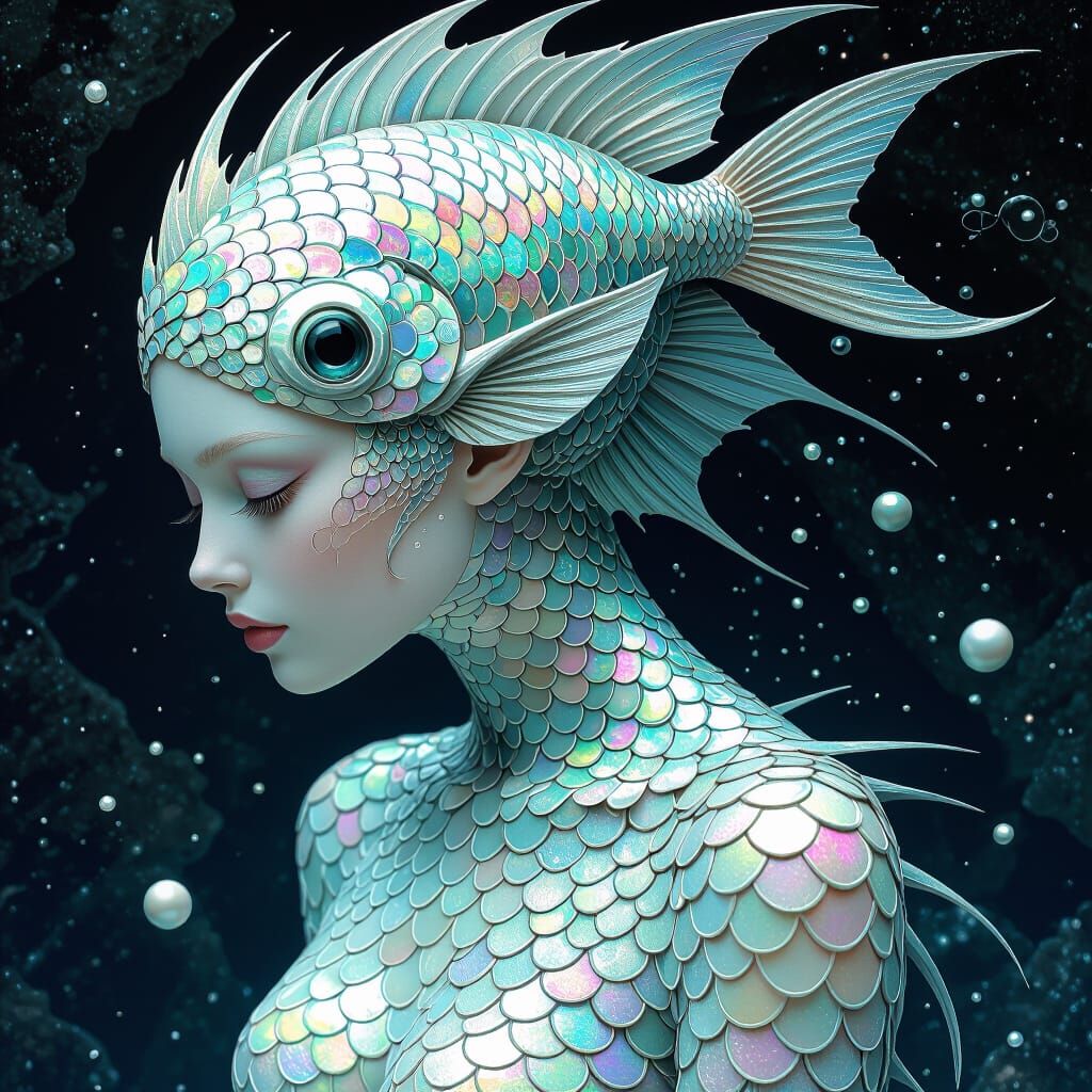 A surreal female figure blends fish and eggshell textures. This mesmerizing image captures a dark, dreamlike aesthetic, reminiscent of surrealist biomechanical art.