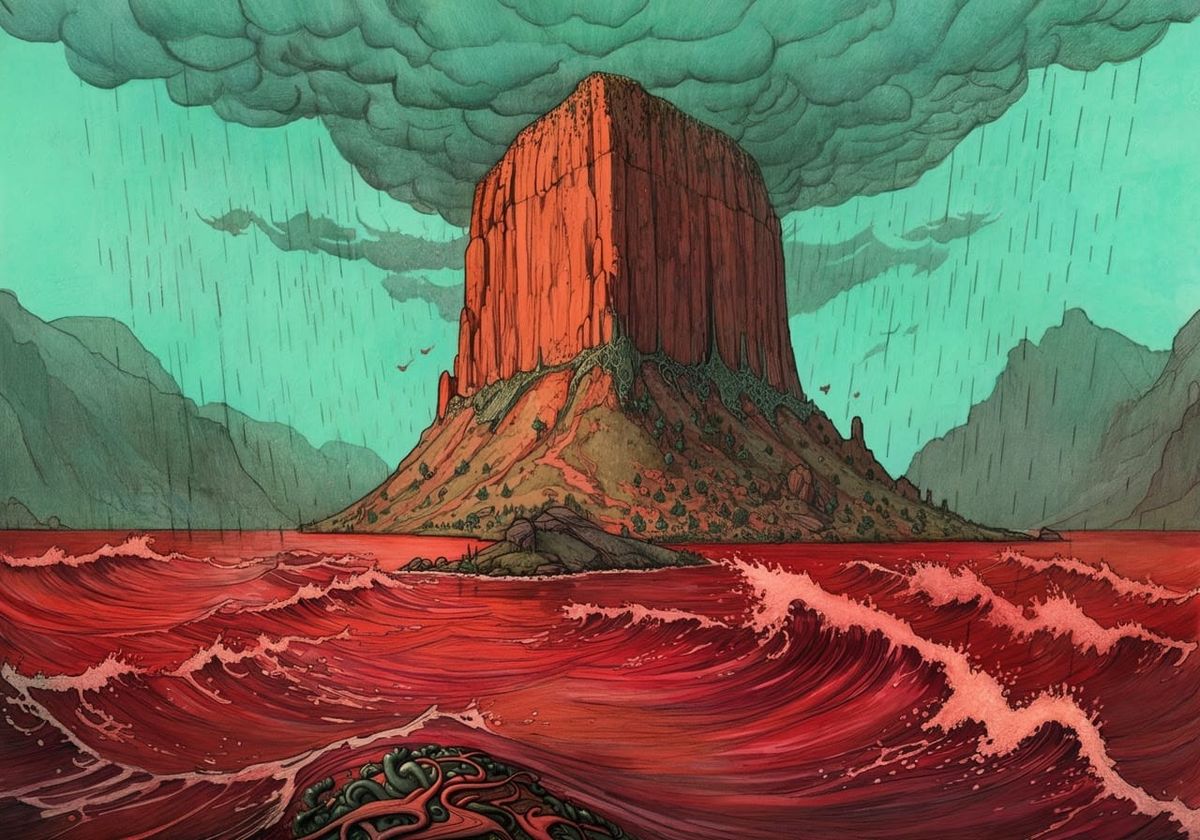 A striking picture of a flat-topped red mesa under a stormy sky, surrounded by turbulent floodwaters. The image is rendered in a whimsical, dreamlike style with intricate organic details and muted earthy tones.