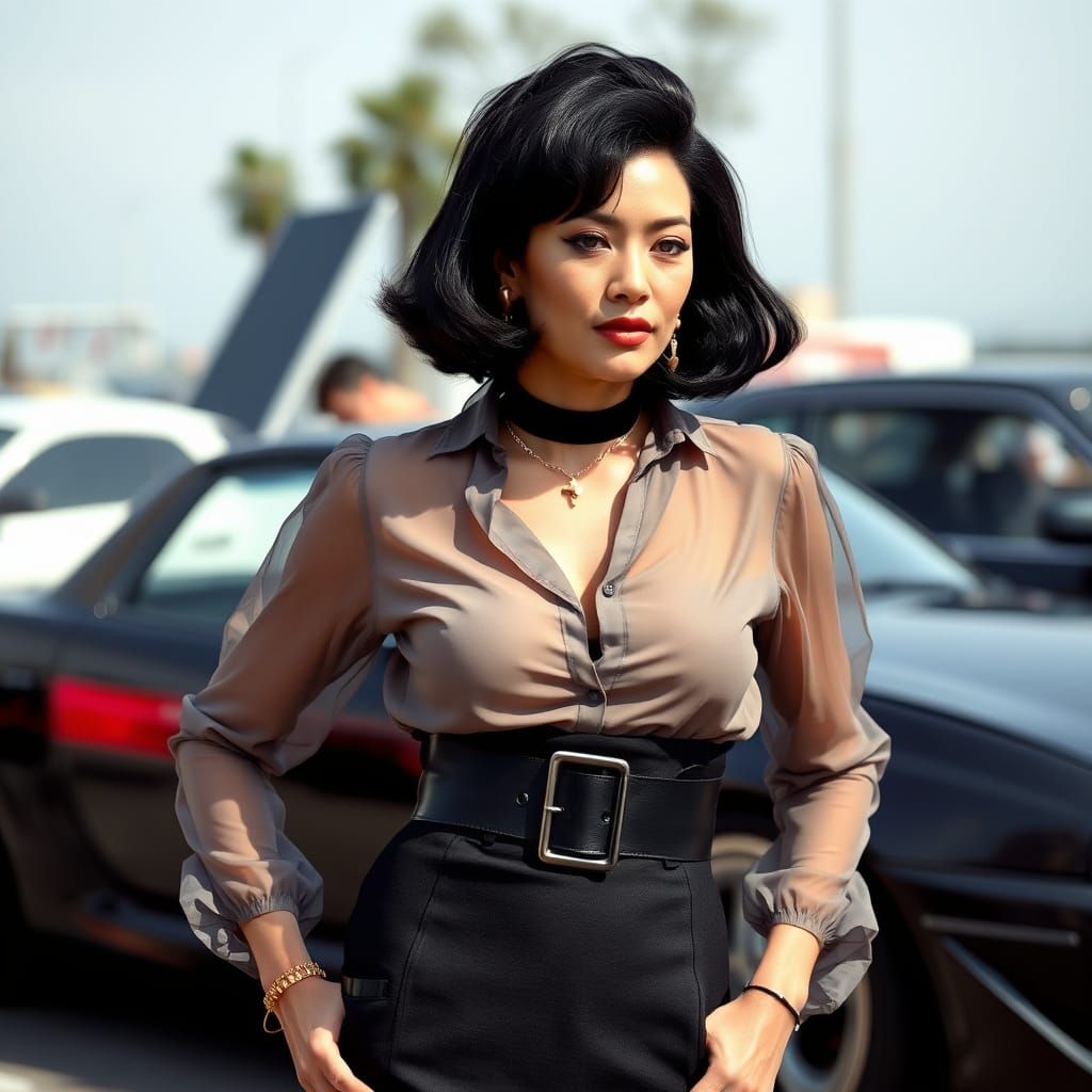 This image shows a vintage cross-dresser at a JDM car meet. The figure, inspired by glam rock and retro-futurism aesthetics, sports an 80s-style outfit with bold accessories.