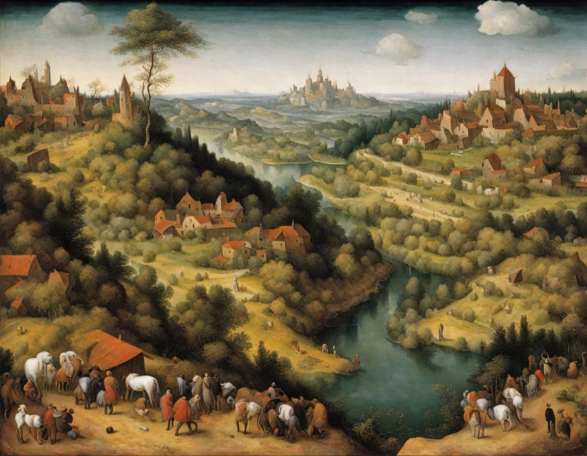 A vibrant landscape in the style of Bruegel. The picture captures the intricate details and panoramic views characteristic of the Northern Renaissance master.