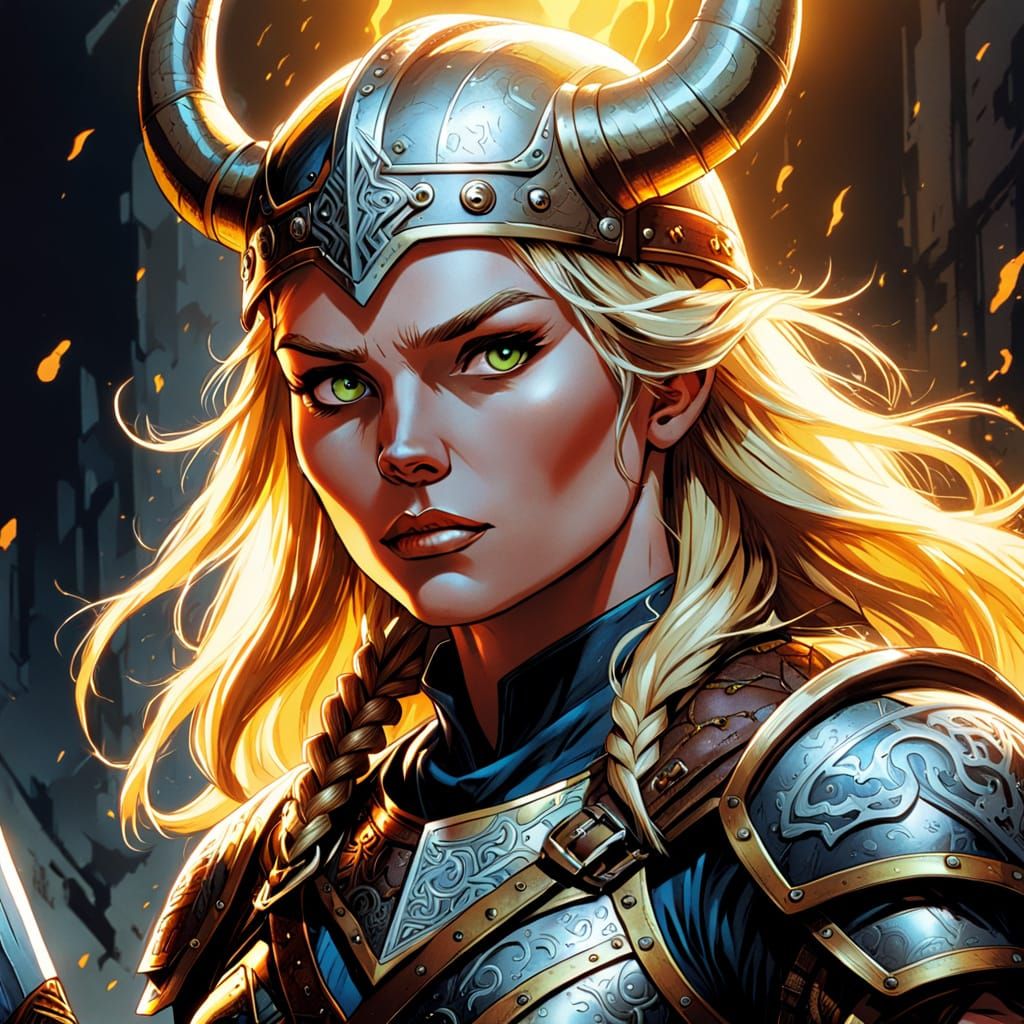A medium shot of a blonde Viking warrior in leather armor and horned helmet. The dynamic image features vibrant inks, bold shadows, and detailed textures in a comic book art style.