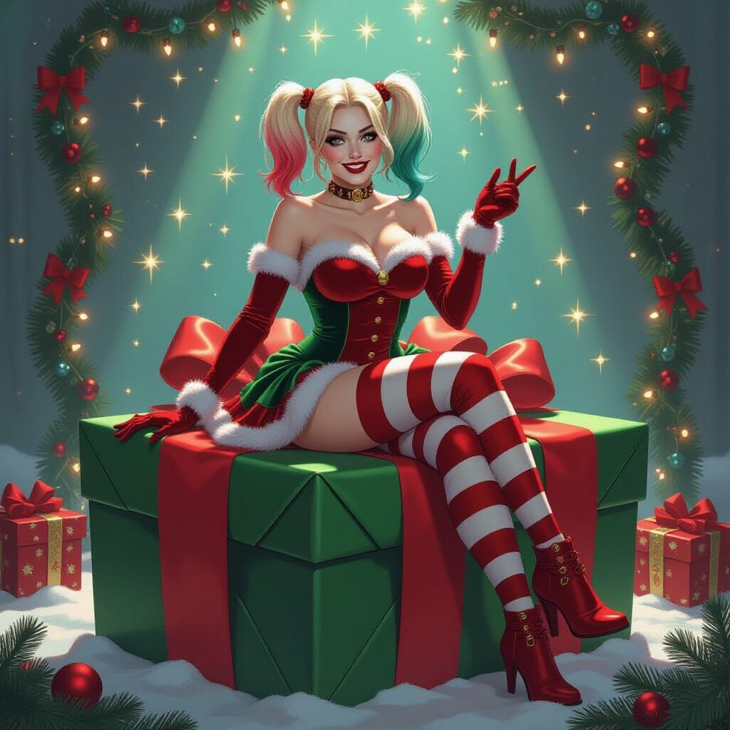This image shows Harley Quinn in a velvet Christmas dress, perched on a giant present amidst holiday decorations. This digital artwork captures a vibrant and festive atmosphere.