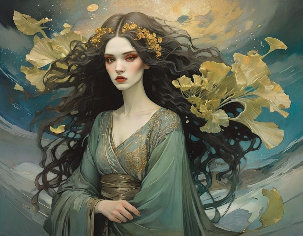 This image evokes a blend of artistic styles, with surrealist undertones and ethereal qualities. The composition and color palette suggest dreamlike themes and symbolic narratives.