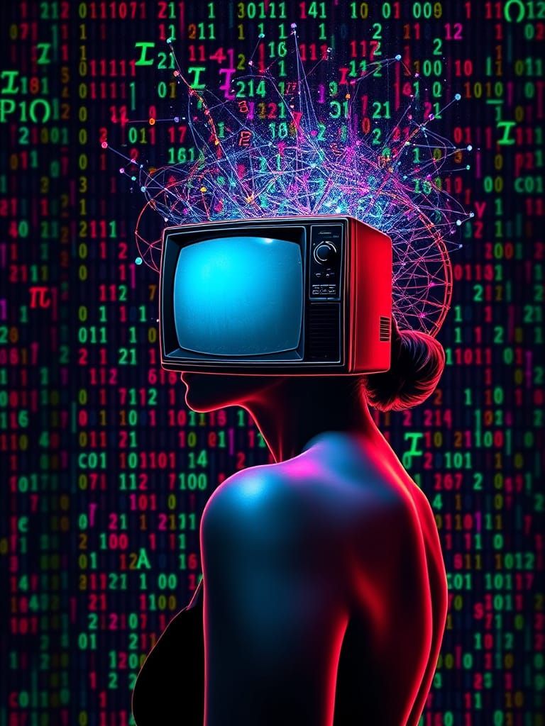 A striking picture of a woman with a television for a head, composed of vibrant mathematical code. The image has a hypnotic color palette and 3D shading, in a brutal academic art style.