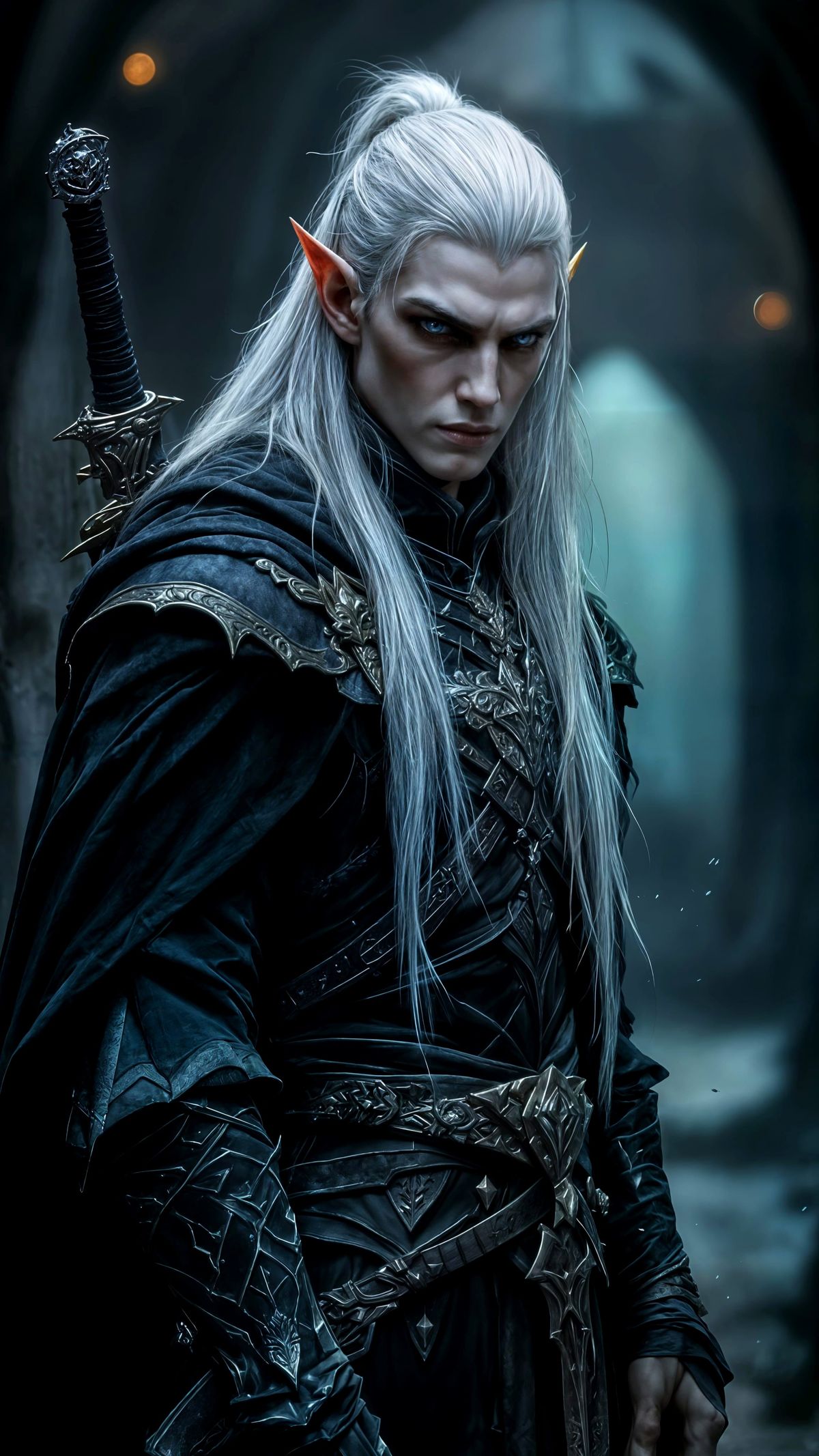 Introducing: Draven Valen, a Dark Elven Warrior-Mage, quiet, mysterious, formidable, Draven leans heavily on arcane elixirs and is a highly trained warrior, Draven is adorned always with black clothes, his long white hair is his signature look, he uses a large sword as well as a dagger occasionally.