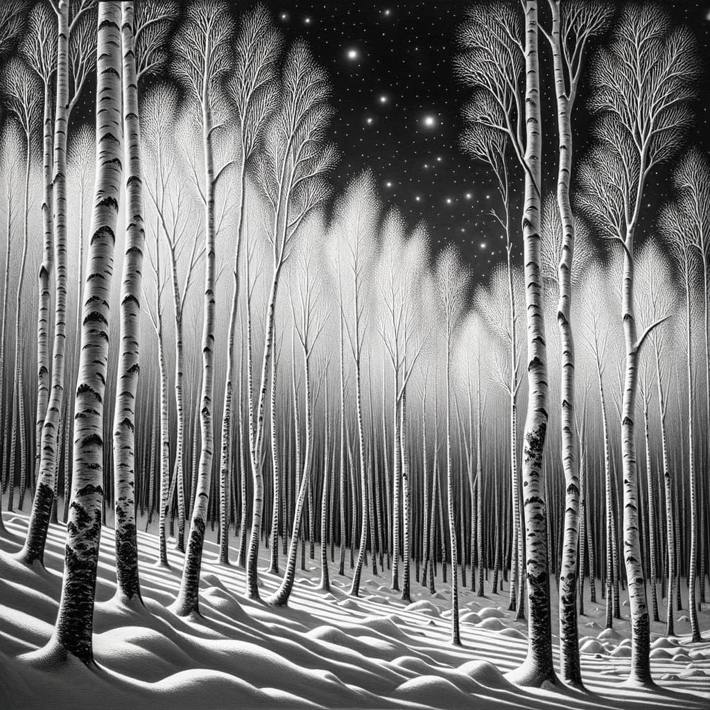 This image shows a serene winter forest scene in black and white, with birch trees and a dark gray sky, featuring a magical atmosphere with starry details.