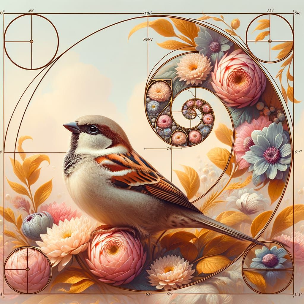 A serene, photorealistic 16k image of a sparrow in a lush, Floralcore-inspired environment, blending Art Nouveau and Art Deco elements with a gentle pastel color palette, evoking a sense of romance and whimsy.