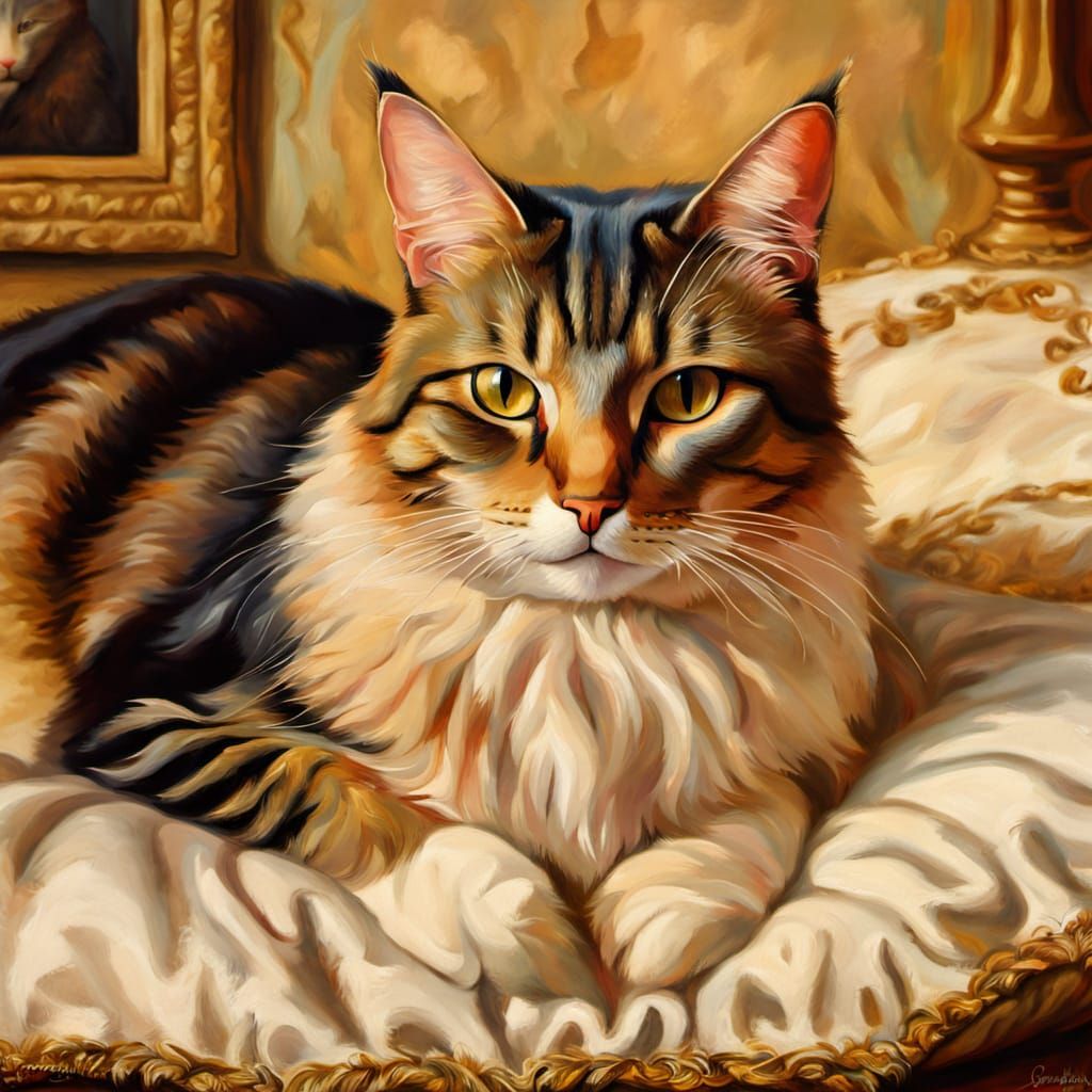This image shows a cat sitting on a pillow in a cozy room, depicted in a Renaissance portrait style. The artwork features soft brushstrokes, warm lighting, and a vintage aesthetic.