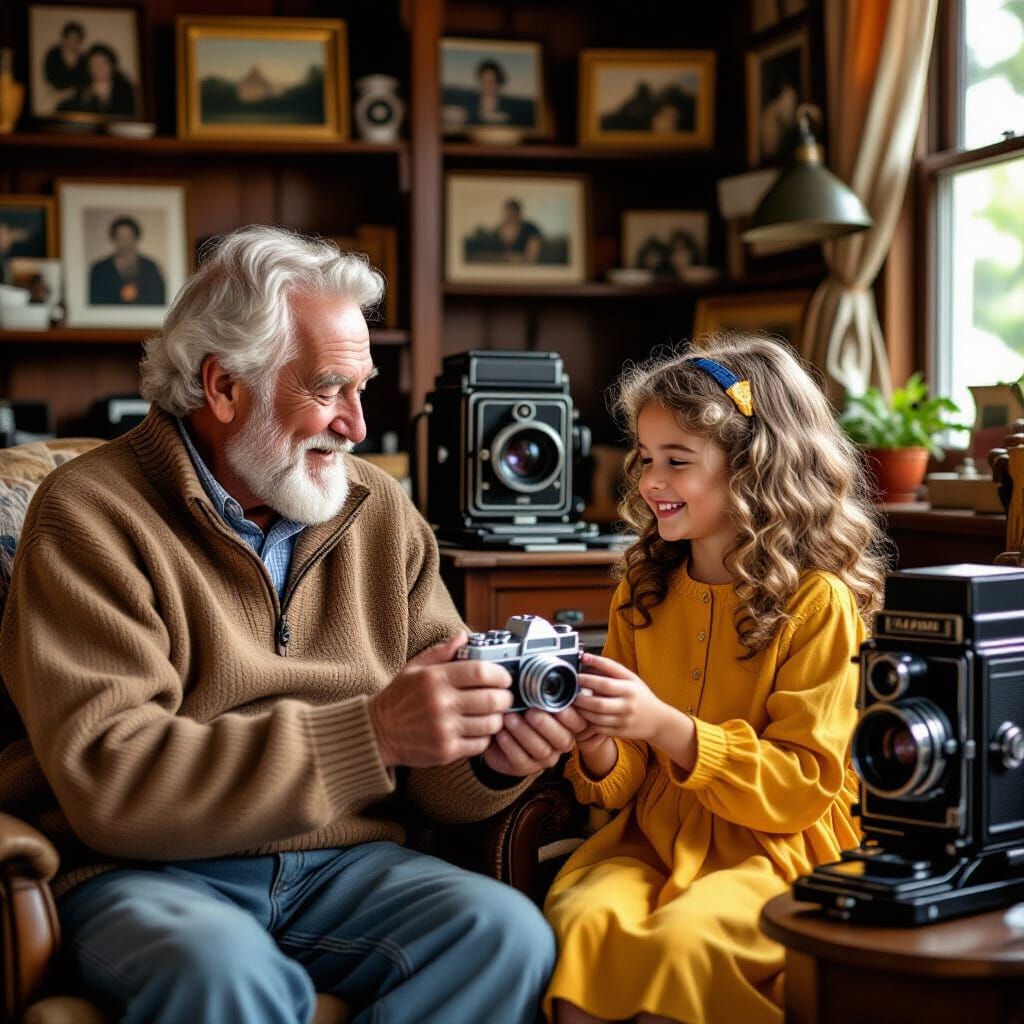 This image shows a grandfather passing his vintage camera to his granddaughter in a room filled with family photos. The scene is captured in a realistic style.