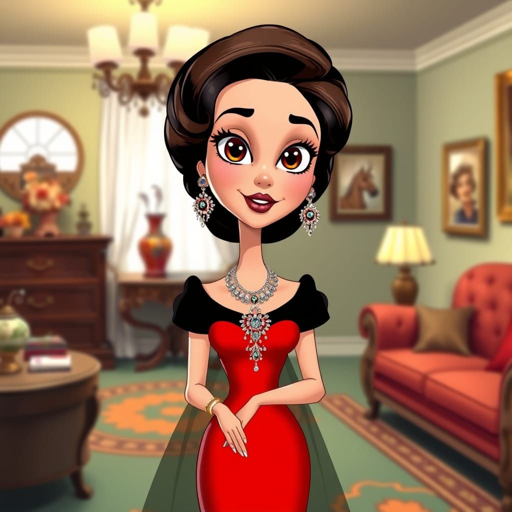 This image shows a beautiful cartoon woman with detailed eyes, wearing a red and black gown and ornate jewelry, standing in a 1960s living room. The aesthetic is cartoon style.