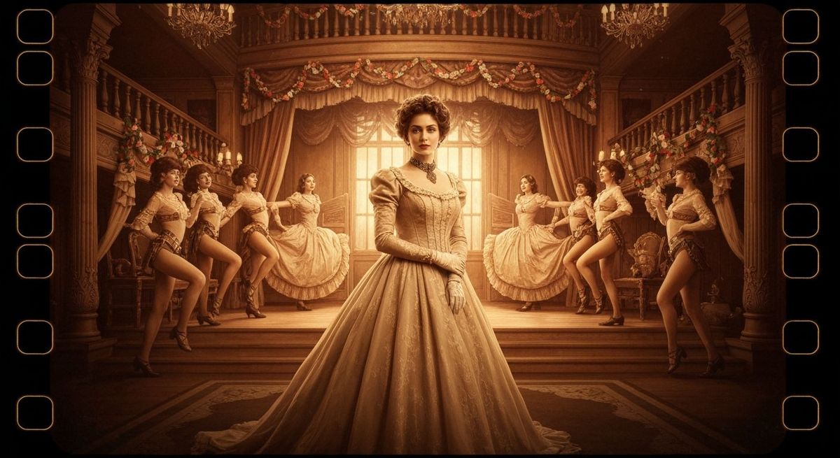 This image shows an elegantly dressed woman in a Wild West saloon, surrounded by dancing girls. The sepia tone and intricate details create a nostalgic 35mm film aesthetic.