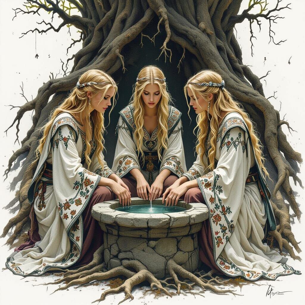 This image shows three Norse goddesses, the Norns, at the foot of the world tree Yggdrasil. The image evokes atmospheric realism with dramatic lighting and intricate textures. The scene is rich with meticulous detail.