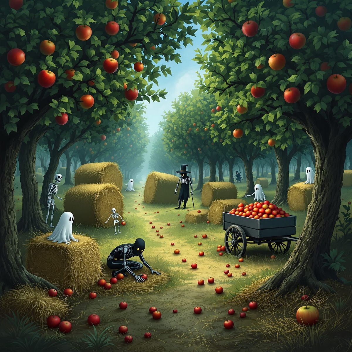This image depicts a spooky haunted apple orchard scene with hay bales, an apple cart, and various ghostly figures and skeletons interacting with fallen apples.