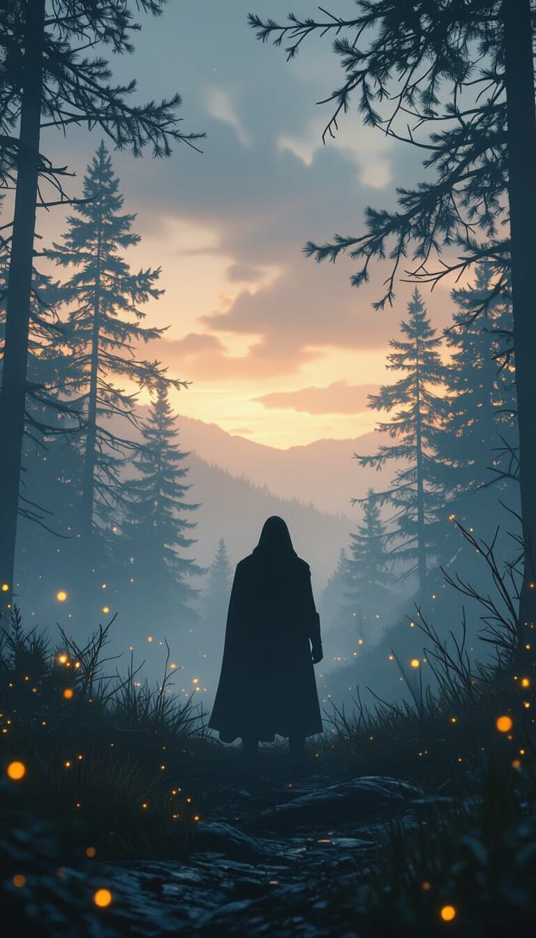 This hyper-realistic image captures a lone figure observing a twilight forest. Deep shadows, soft glowing lights, and swirling mist create an ethereal, atmospheric mood with cinematic detail.