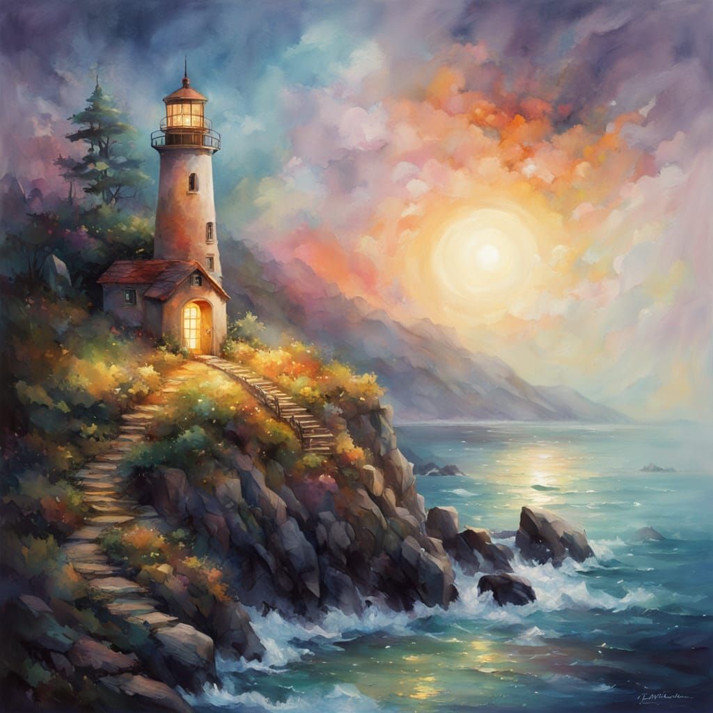 A whimsical, abandoned lighthouse stands on a rocky outcrop, its beam replaced by a shimmering, iridescent portal that pulses with soft, multicolored light. Below, the sea churns with an unusual, ethereal glow. Tiny, glowing sprites flit around the lighthouse, drawn to the portal's magic. This scene ...
