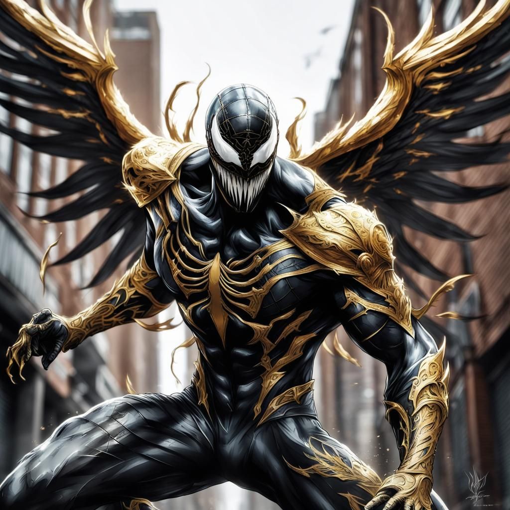 This image depicts a fierce Venom Symbiote reimagined as an angelic ninja. It features intricate details, powerful wings, and is rendered with vibrant, high-contrast colors in a street art style.
