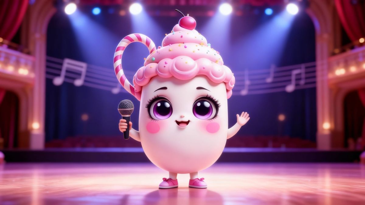 A whimsical, ultra-adorable chibi milkshake character with sparkling eyes dances joyfully by a retro ice cream truck. This image features a magical, sugary wonderland with floating ice cream cones and pastel sparkles.