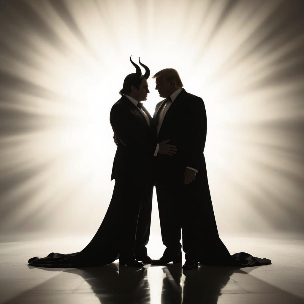 This image depicts a controversial and evocative scene of Satan and Donald Trump intimately embracing. The composition uses cinematic lighting and film grain to create a dark and ominous atmosphere.