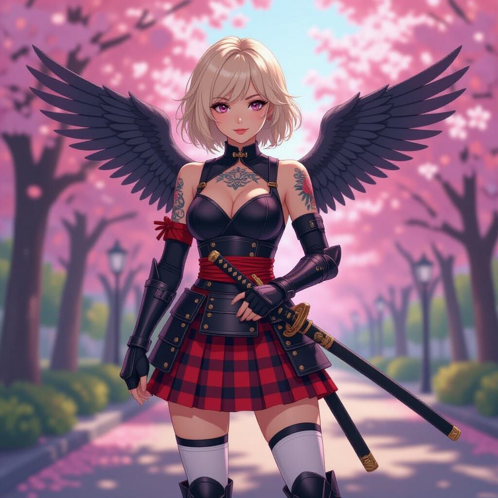 This image shows a young woman with blonde hair and wings tattooed on her collarbones, wearing samurai armor and a checkered skirt. She is holding a samurai sword in an anime style with cinematic lighting.