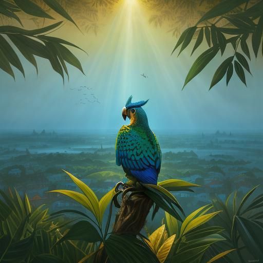 A striking picture of a leopard shaman in a flooded city, with a blue parrot on its head. The visionary surrealist art features power ranger leopards and a scepter of green lights in warm, golden light. The colors are vibrant and triadic.