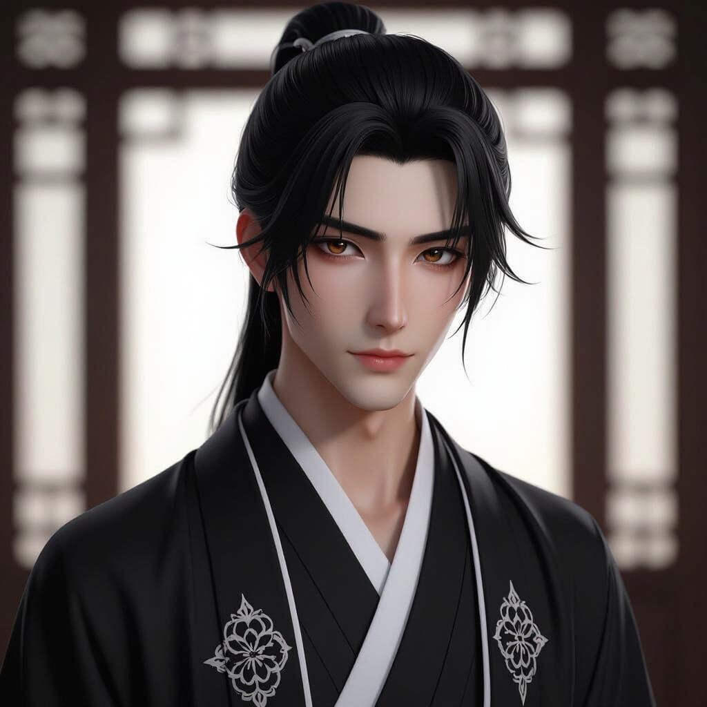 This image features a slender man with pale skin and black hair, dressed in a flowing black eastern robe. Captured in dramatic chiaroscuro lighting, it's a realistic digital painting with ultrafine detail, inspired by anime art styles.