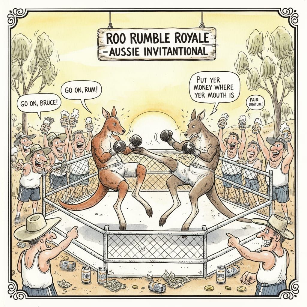 This humorous illustration shows two kangaroos boxing in an MMA octagon, watched by cheering Aussies. Rendered as a detailed ink sketch with watercolor.