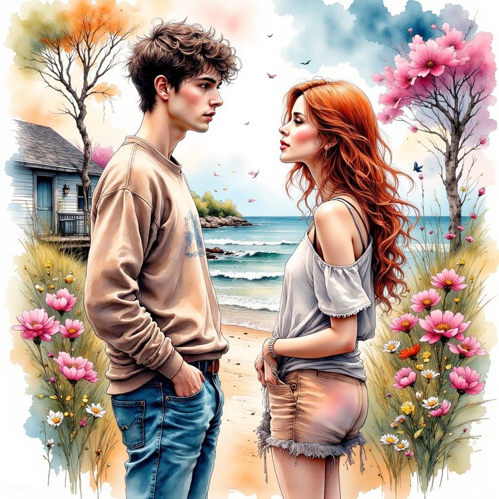 A young man stands near a beach house, lost in thought as he talks to a flirtatious woman, in a whimsical ink drawing style with vibrant colors and soft textures, evoking a sense of nostalgia and longing.