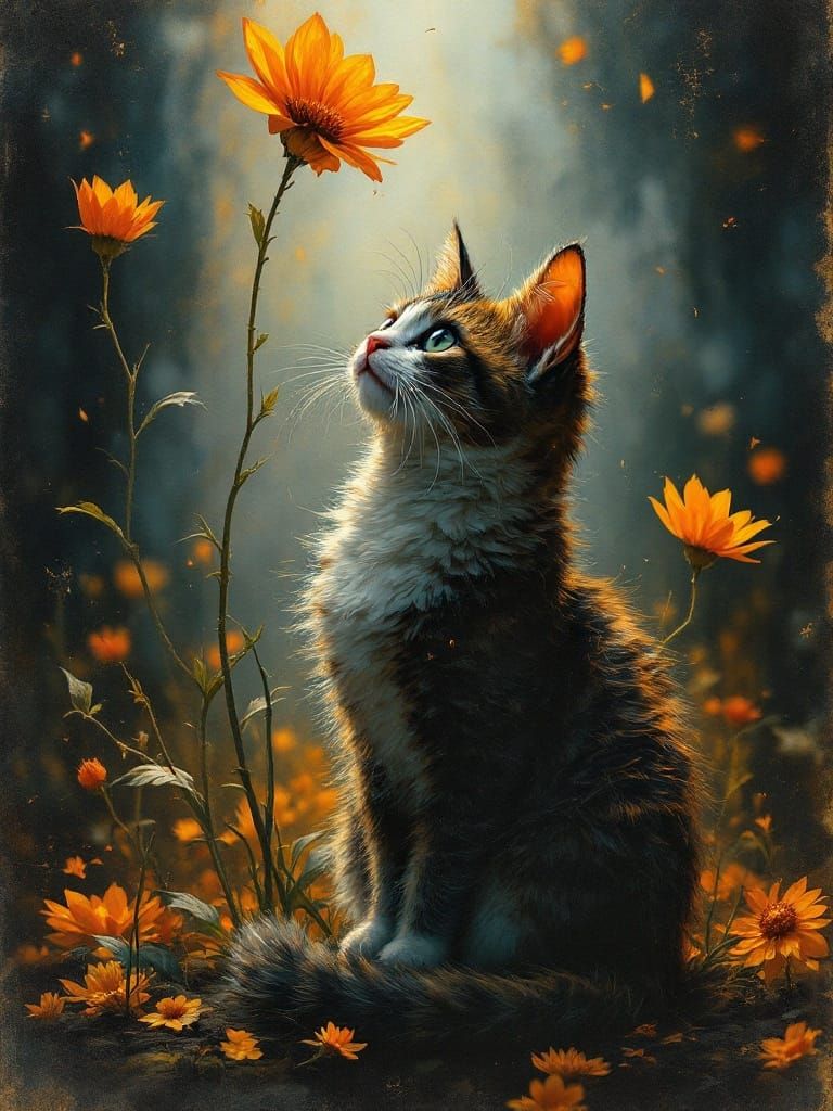 This image showcases a whimsical autumn scene with a cat gazing at a sunflower, captured in a cinematic photography style with dramatic rim lighting, high-contrast color grading, and subtle textural weathering.
