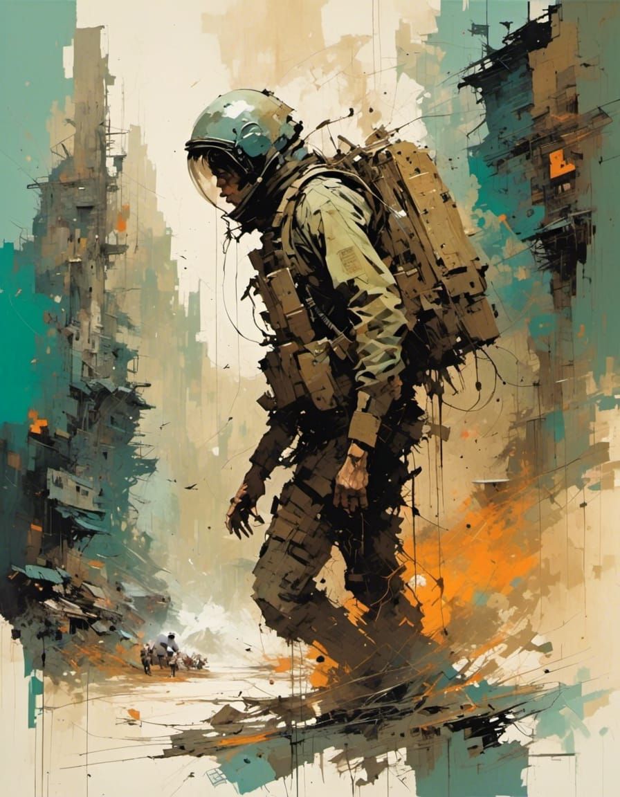 This image shows a blurred figure moving at incredible speed through a landscape. The person appears to be vibrating and distorting reality, creating a sense of dynamism and dimensional tearing.