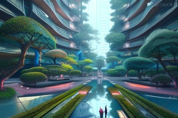 A vibrant image of a corporate plaza in a cyberpunk aesthetic. The scene includes detailed stonework, serene reflective pools, and lush gardens, all rendered as a maximalist digital painting.