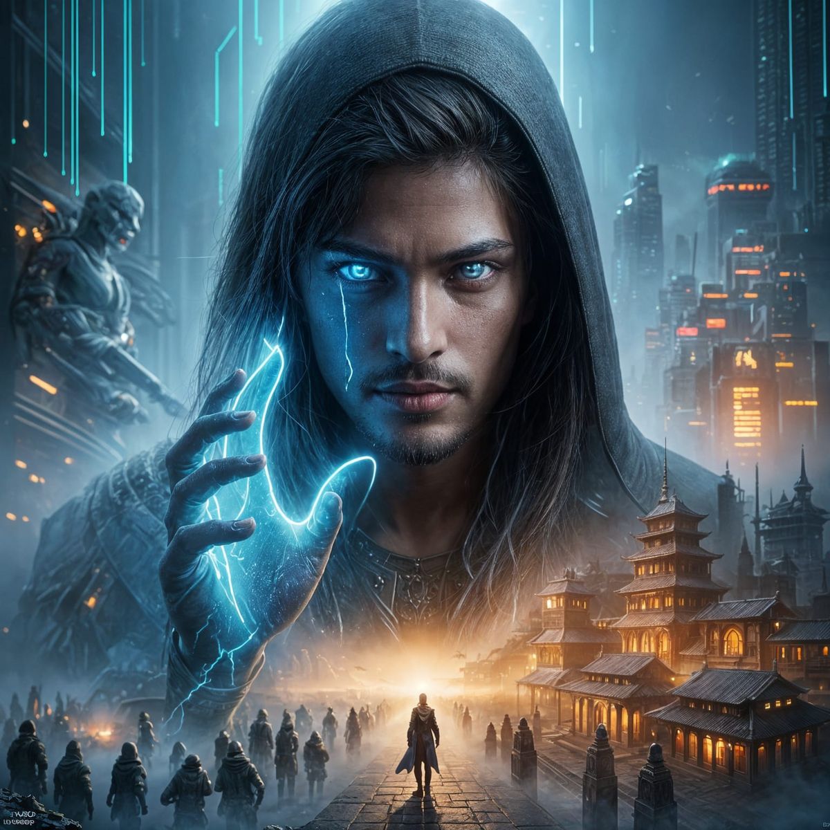 A close-up portrait of a South Asian male figure in a cyberpunk setting, surrounded by miniature towns and individuals, with a blue aura and eerie blue eyes, set against a moody, atmospheric backdrop with intricate details and high contrast.