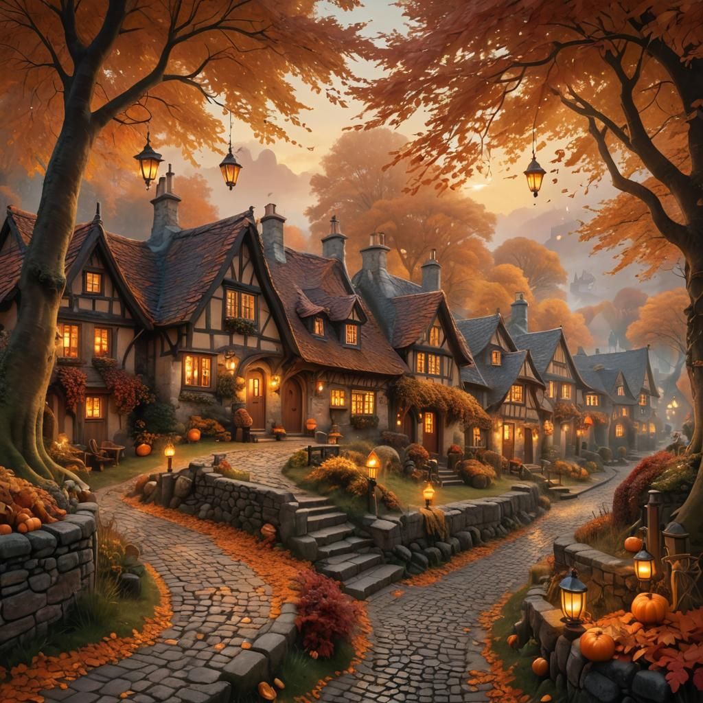 A matte painting of a fairy village in autumn. Quaint cottages line a cobblestone path, lit by glowing lanterns and surrounded by swirling mist and autumn colors in this fantasy concept art.