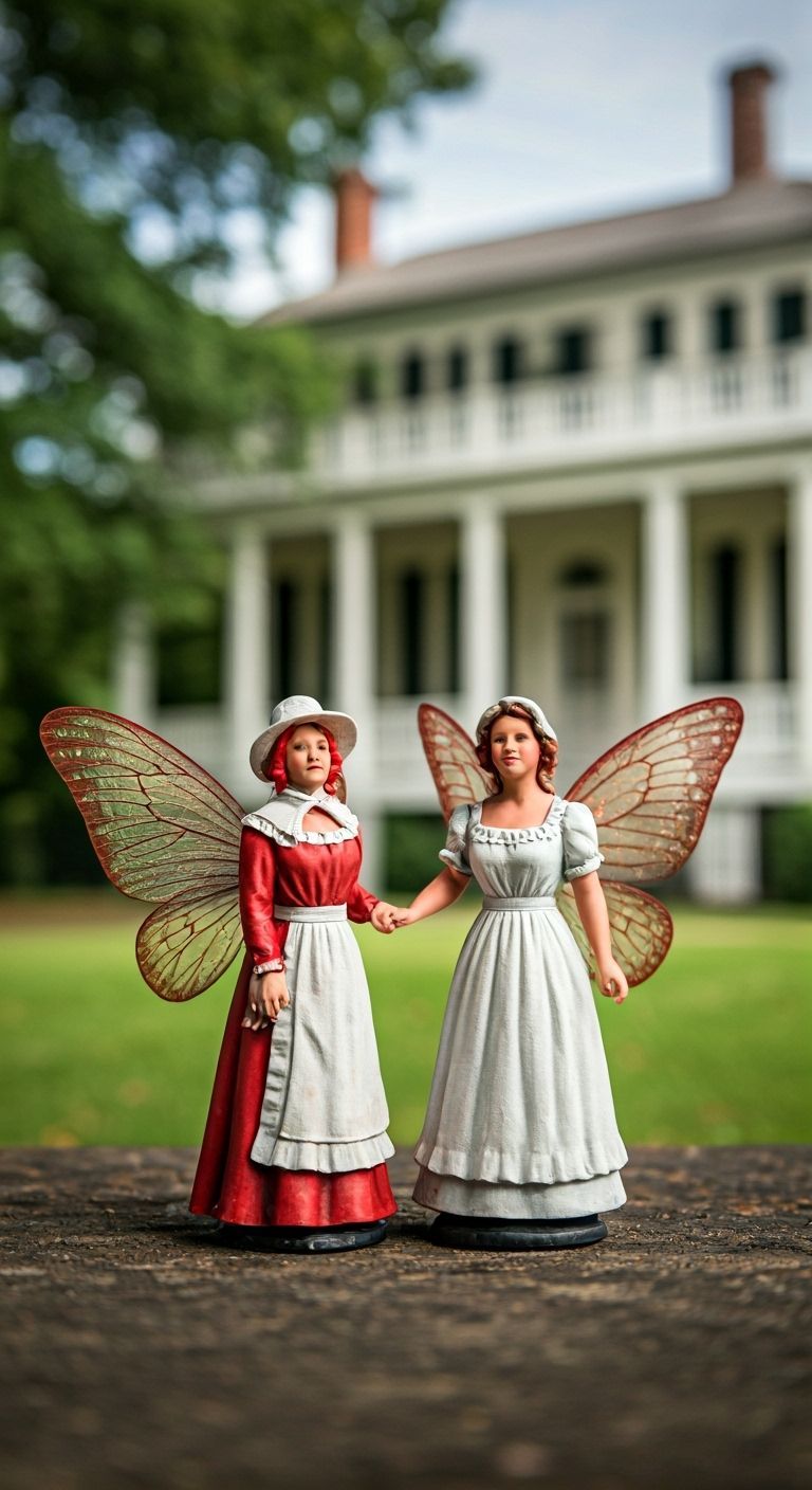 This image depicts miniature winged fairies alongside a Southern belle in front of a plantation house. The scene blends fantasy elements with a historical setting.