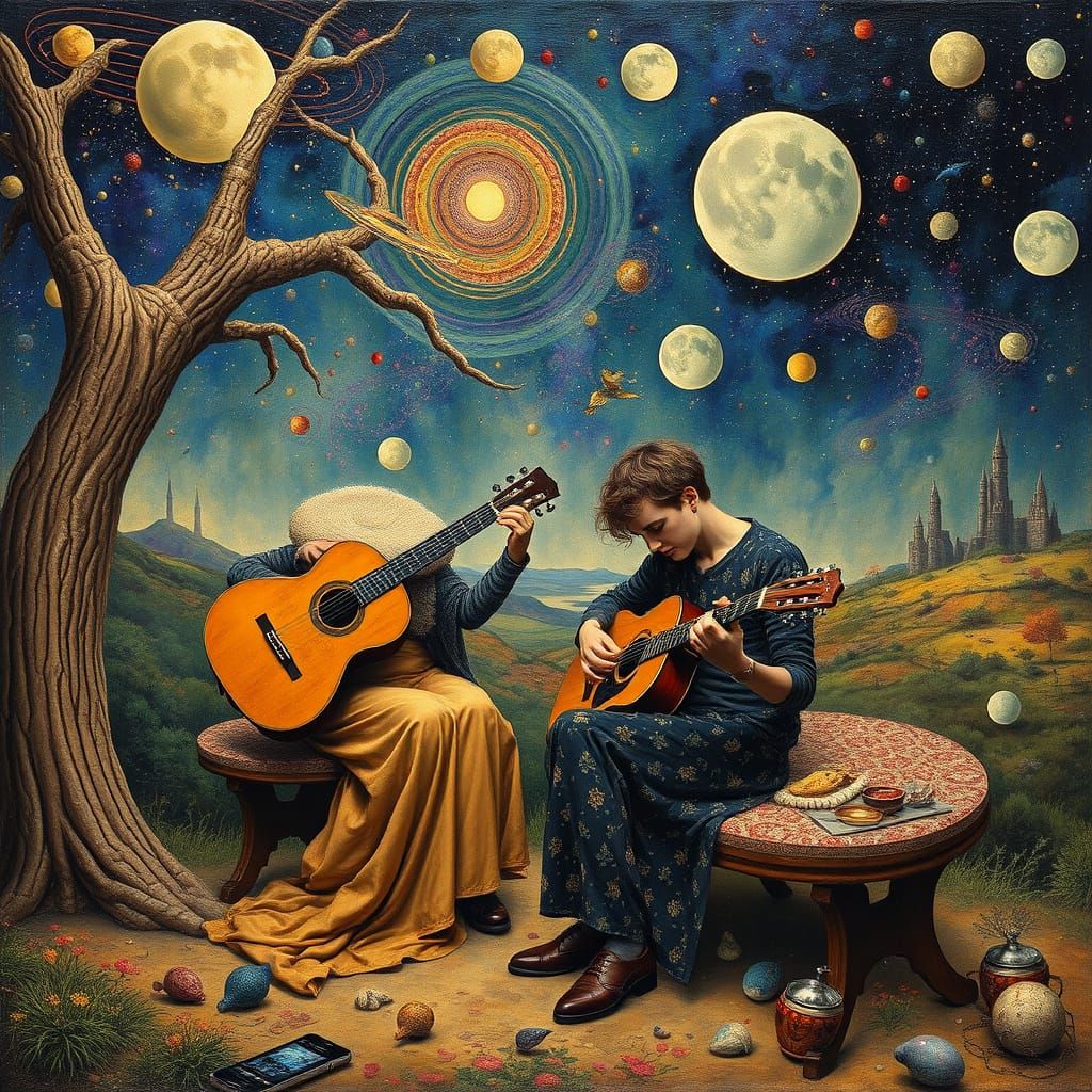 A surreal image of a maximalist accordionist in a psychedelic utopia. The oil painting evokes bizarre scenes of cosmic proportions, rendered in a maximalist style.