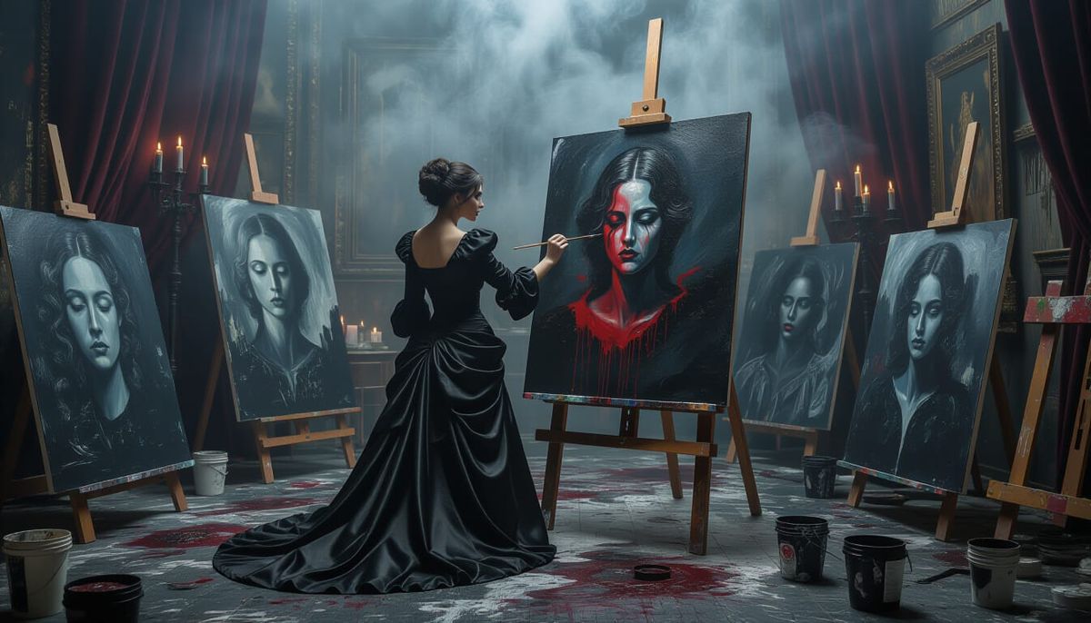 This image shows a gothic artist in a dark satin dress, surrounded by paintings reflecting inner despair. The scene is lit by candles, emphasizing the eerie atmosphere. The artwork is reminiscent of dark gothic art.