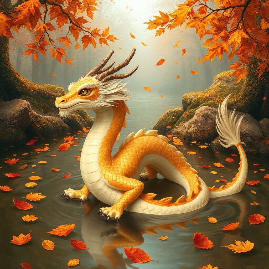 This image shows a serene Eastern dragon with ivory and orange scales floating in an autumn pond. Crimson and amber leaves swirl around it in a whimsical, realistic style.