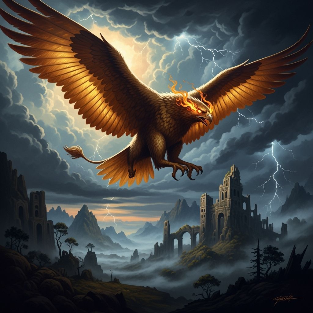 This image shows a griffin flying through a stormy sky, its golden feathers catching the light. The scene evokes a sense of ancient wisdom and heroic fantasy with dramatic lighting and highly detailed textures.