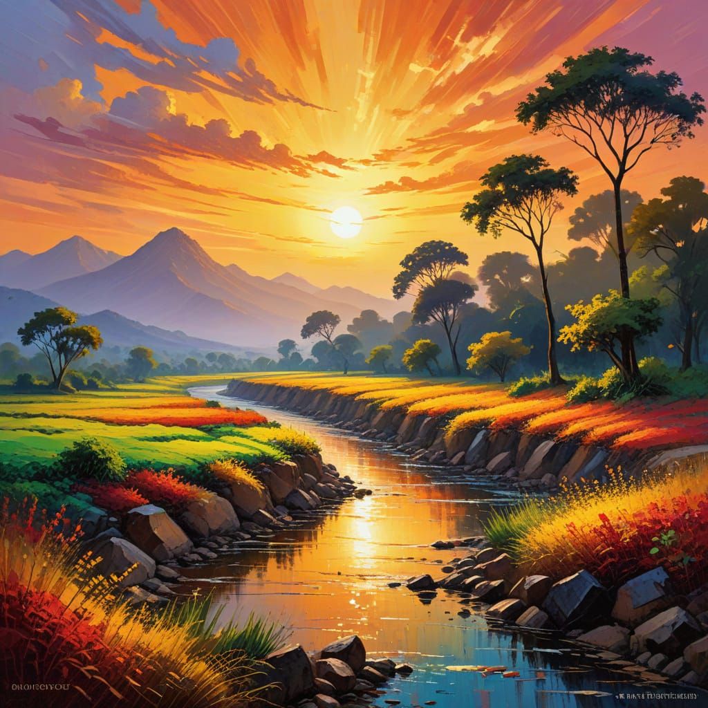 A vibrant impasto painting of a river confluence at golden hour. This landscape scene captures the meeting point of five rivers with textured brushstrokes in an expressionist style, using a warm and colourful palette.